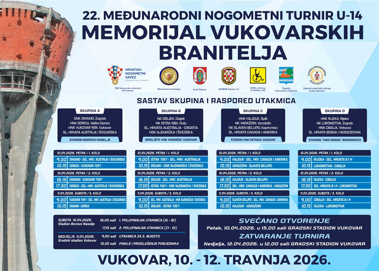 Objavljen je službeni raspored natjecanja za 22. međunarodni nogometni turnir U-14 „Memorijal vukovarskih branitelja“, koji će se održati od 10.